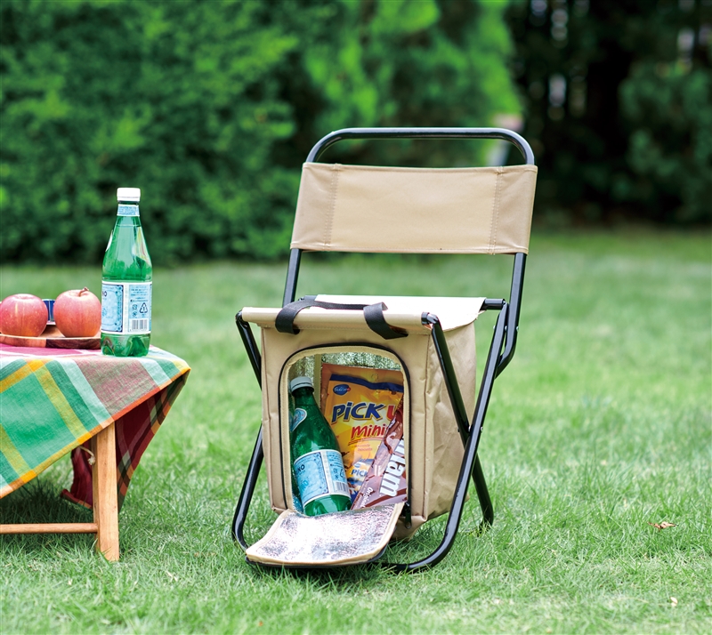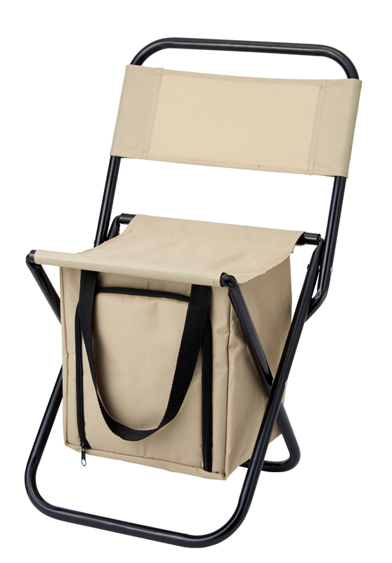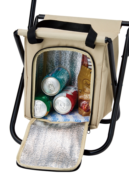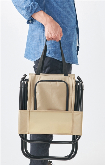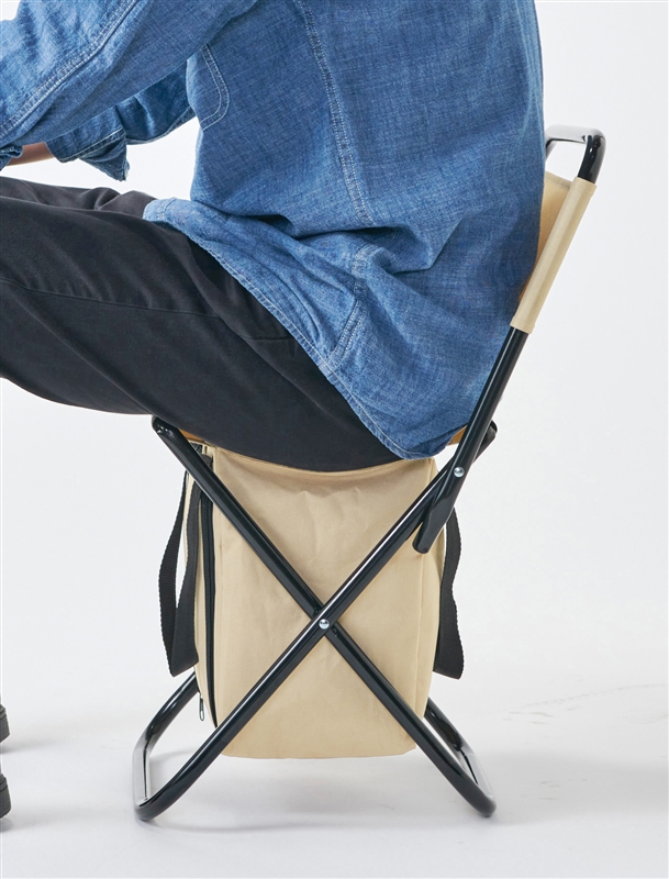 座面下に保冷温バッグを備えた多機能チェア。ドリンクや軽食を入れられて、アウトドアやイベントで大活躍!