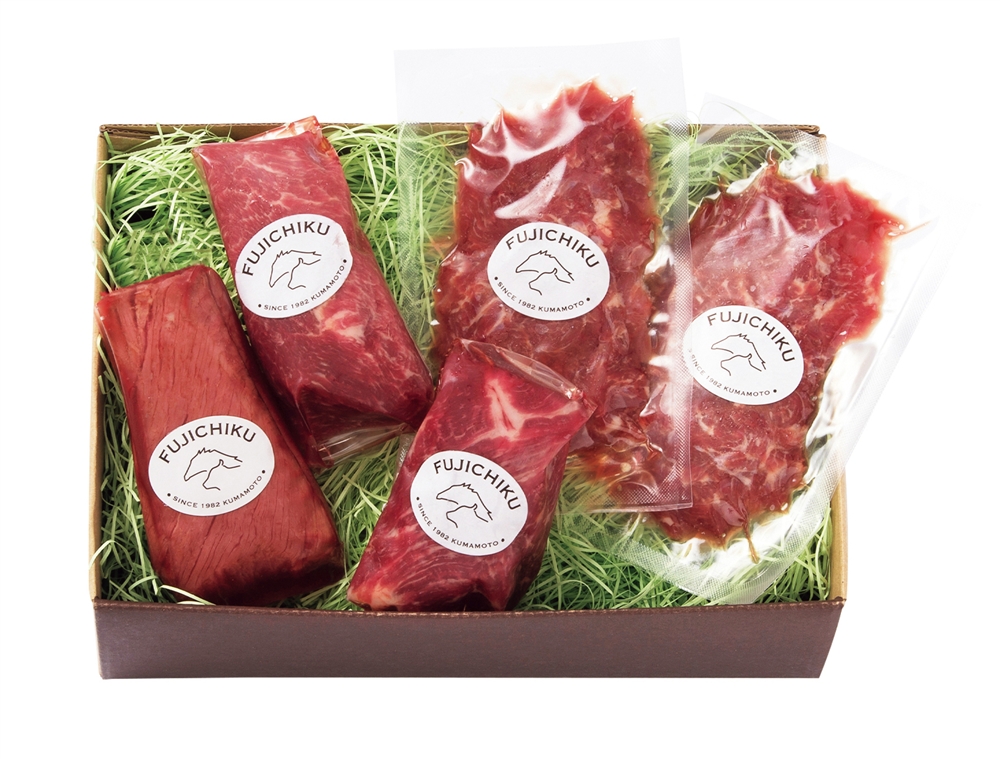 | 備考 | <セット内容> ふじ馬刺したたき80g×1、ふじ馬刺しロース80g×1、ふじ馬刺し上赤身80g×1、ふじ馬刺しユッケ50g×2、馬刺しのたれ5ml×4、おろししょうが3g×4、ユッケのたれ10g×2、たたきのたれ20g×1 |
