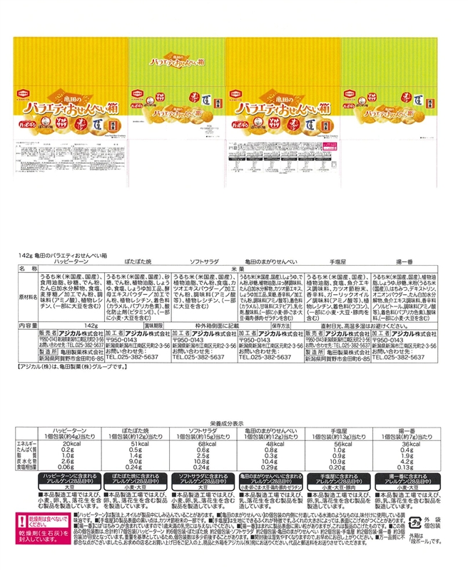 | 備考 | <セット内容> ソフトサラダ・手塩屋・ぽたぽた焼・まがり煎餅×各2、揚一番×3、ハッピーターン×6 |