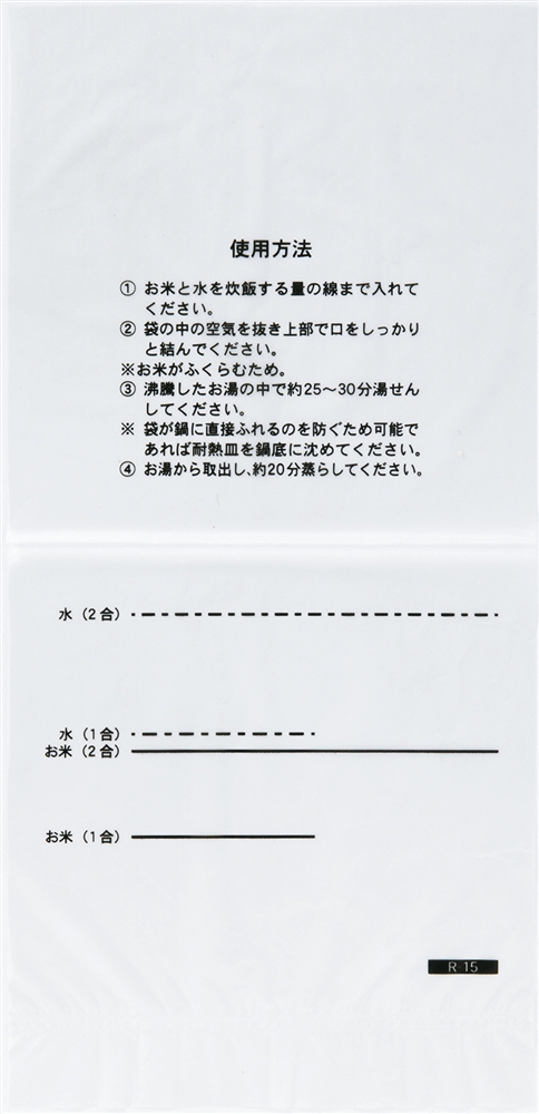 袋本体にお米と水の量の目安線が印刷されています。高密度ポリエチレン製。 ●耐熱温度:110度●耐冷温度:-30度