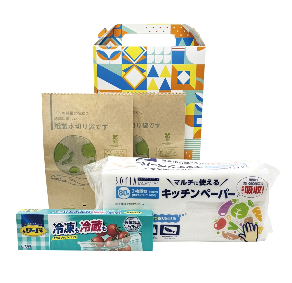 食品を保存するに役立つ保存バッグや水回りで使用できる水切り紙袋、キッチンペーパーなどを取り揃えたギフトセットになっております。