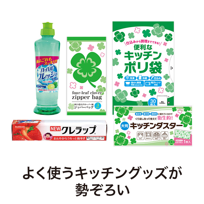 | 注意事項 | ■内容:NEWクレラップ22cm×10m・ハーバルフレッシュコンパクト(グリーンライム) 250ml・ジッパーバッグ(3枚入)・キッチンダスター(1枚入)・キッチンポリ袋(30枚入) 各1 |