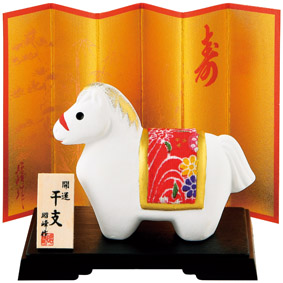 艶やかな金屏風に2026年干支「午」の置物が