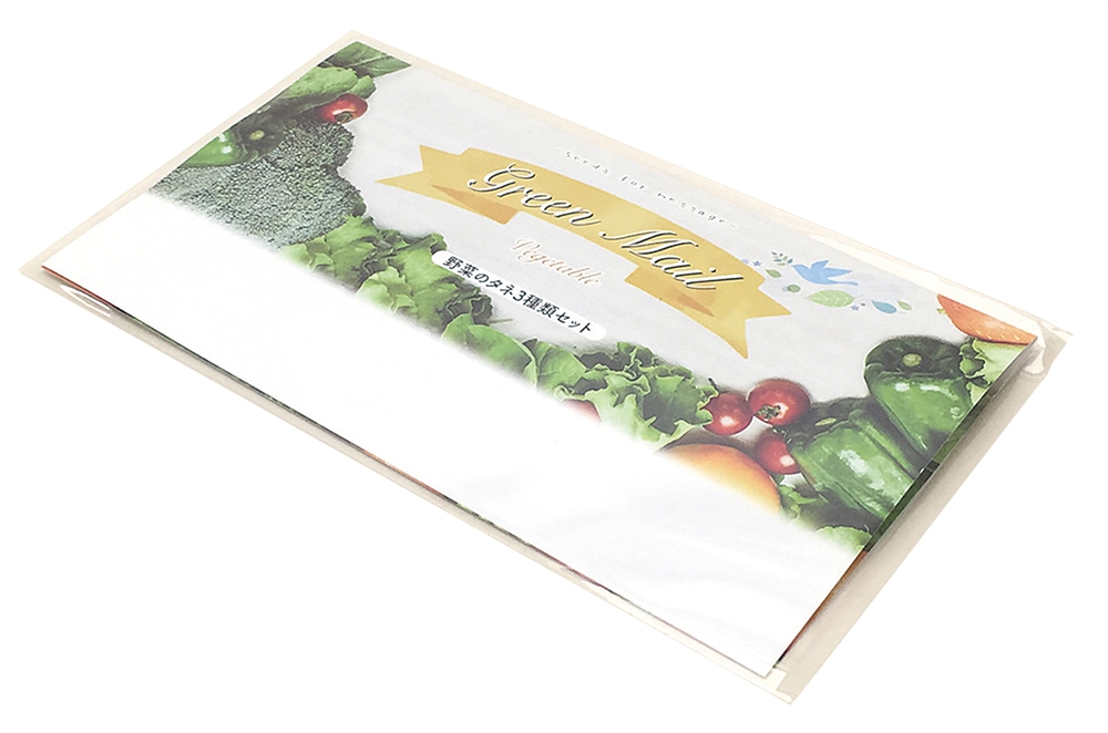 二つ折りの台紙に3種類の野菜の種子付き。 台紙にはオリジナルメッセージを入れられます。