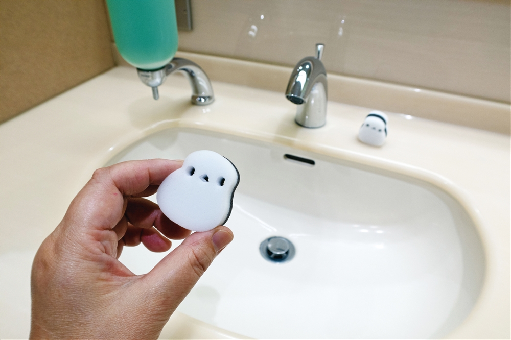 ちょこんと置けて可愛くて、機能的なスポンジです。洗剤なしで水をつけてこするだけで汚れを落とせます。水アカ、茶シブ、手アカ落としに。キッチン、洗面台などの水回りに置いておくとかわいくて便利です。
