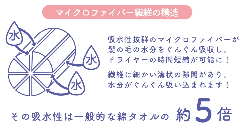 吸水性抜群のマイクロファイバーが髪の毛の水分をグングン吸収し、ドライヤーの時間短縮が可能に! 繊維に細かい溝状の隙間があり、水分がぐんぐん吸い込まれます!その吸水性は一般的な綿タオルの約5倍! 約40×100cmの大きめサイズなので、頭部をすっぽり覆います。 巻きやすく、使い勝手の良い大きさにこだわりました。