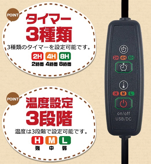 ■敷くだけであったかグッズに変身! ちょうどいい温度のUSBヒーターマット!ペットハウスやクッションに敷くだけであったかグッズに変身します! ■低消費電力で経済的! 1日(8時間)使用で約1円の低消費電力タイプ! ※電気料金1kwh=27円の場合。使用環境や電力会社・契約内容によって異なります。 ■タイマー3種類!温度設定3段階! 3種類のタイマーを設定可能です。温度は3段階に設定可能。