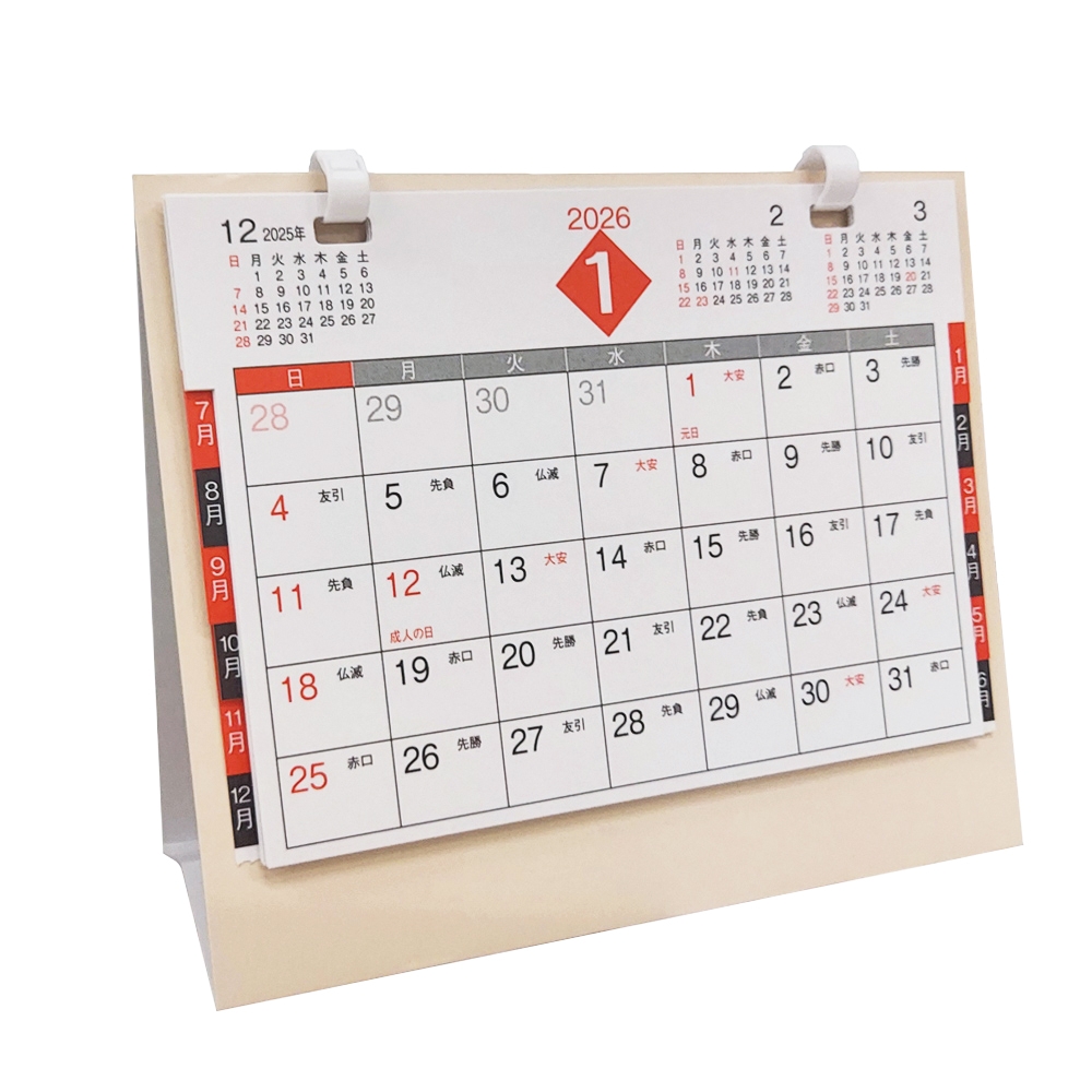 2026年 卓上カレンダー。インデックスが付いて使いやすく、先月・翌月・翌々月を表示。配布用カレンダーにぴったりなカレンダーです。