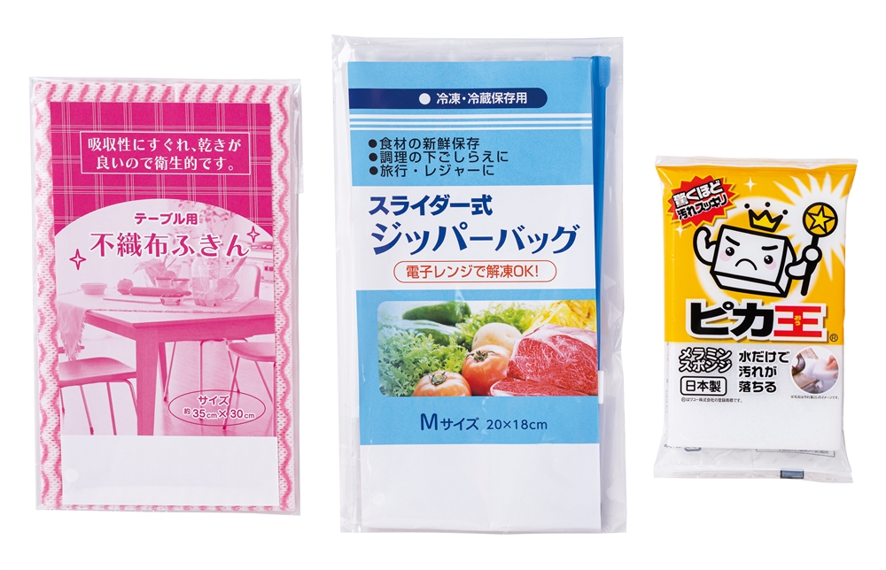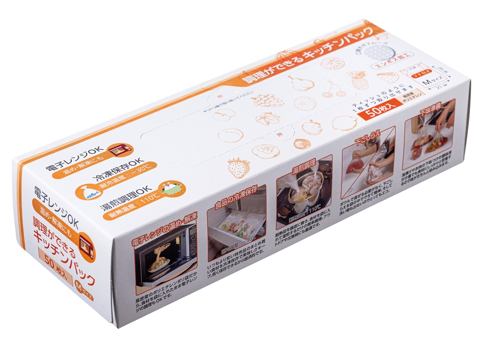 備考 | <セット内容> ●調理ができるキッチンパックM50枚BOX×1 ●ピカ王ミニ×1 ●不織布ふきん1枚×1 ●フリーザーバッグM5枚×1 ●スライダー式ジッパーバッグM1枚×1 |