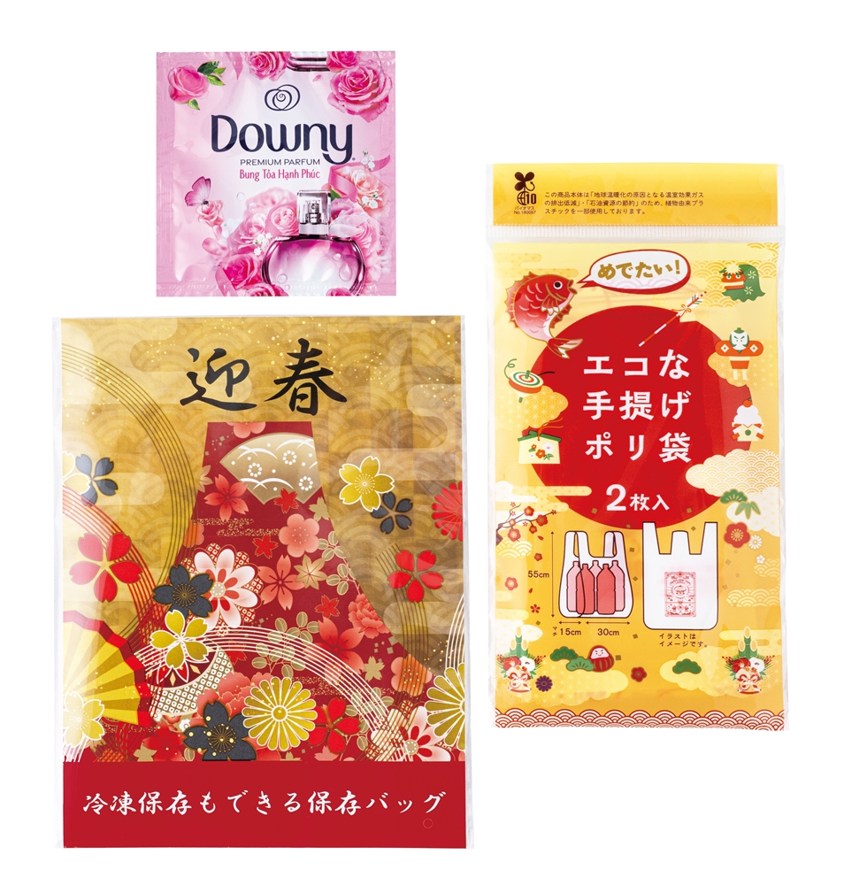 備考 | <セット内容> ・P&G除菌ジョイコンパクト170ml(さわやか微香)×1 ・迎春柄フリーザージッパーバッグ1枚×1 ・めでたいエコな手提げポリ袋2枚入×1 ・ライオンリードクッキングペーパー小4枚×1 ・ダウニー×1 ・ネットスポンジ×1 ※ダウニーは不均等アソートになります。 ※ネットスポンジは4色不均等アソートになります。 |