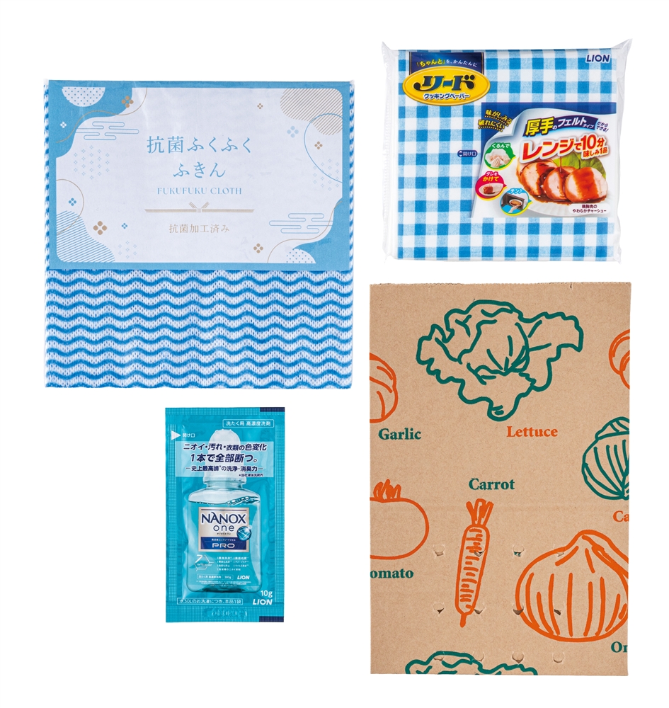 備考 | <セット内容> ・ライオン チャーミーグリーン260ml×1 ・ライオン NANOXonePRO10g×1 ・ライオン リードクッキングペーパー小4枚×1 ・紙製水切り袋1枚×1 ・抗菌 ふくふくふきん1枚×1 ・ネットクリーナー×1 |