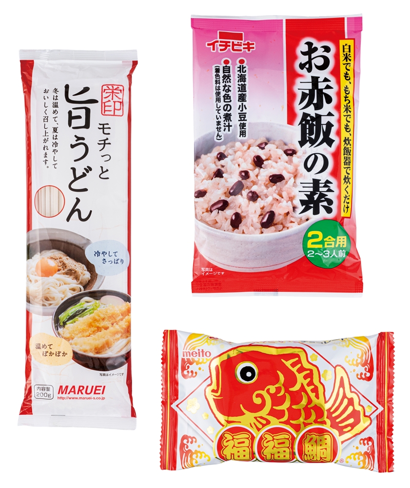 | 備考 | <セット内容> ・イチビキ 寄せ鍋つゆ720g×1 ・イチビキ 赤飯の素2合用100g×1 ・本醸造しょうゆ300ml×1 ・モチっと旨うどん200g×1 ・福福鯛×1 ・ハートふりかけ紀州南高梅2.5g×1 |