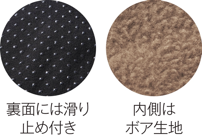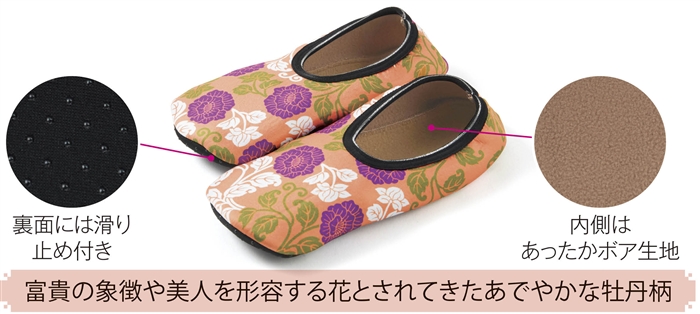 富貴の象徴や美人を形容する花とされてきたあでやかな牡丹柄と、あったか裏ボア仕様で冬のおうち時間も気分が上がる!底面にはすべり止め付き。 ※製造工程上、柄の出方は写真とは異なります。