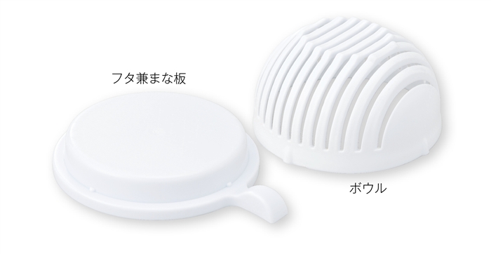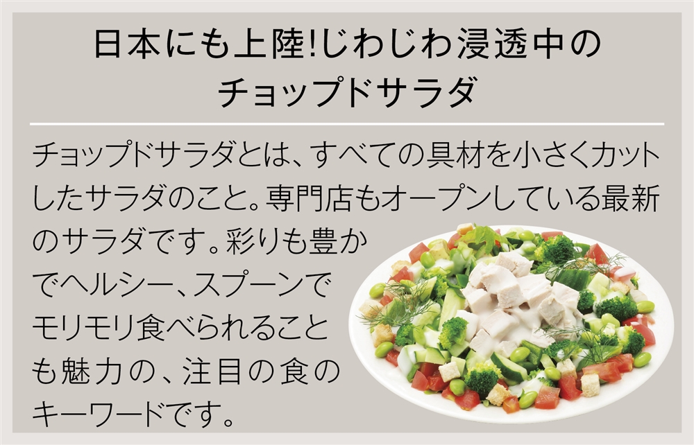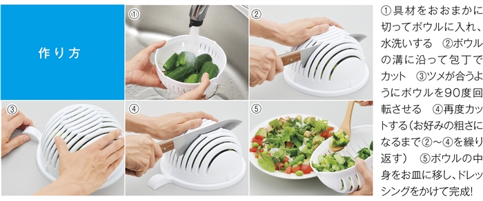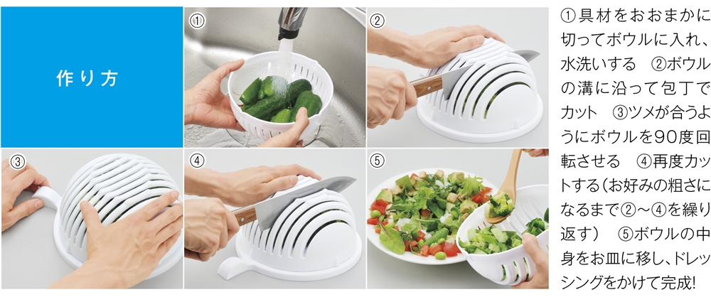 お好みの具材をボウル部分に入れて水洗い、あとは回転させながらお好みの粗さになるまでガイドに沿ってザクザク切れば、あっという間にチョップドサラダが完成♪スプーンでもりもり食べられる、今話題のサラダをおうちで楽しもう!訴求力の高いパッケージも魅力的。