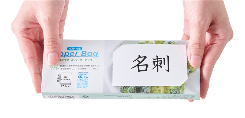 冷凍にも対応したジッパーバッグ。化粧箱は名刺差し込み用のスリット付きです。CO2排出権付商品で、この製品1個あたりCO2排出量が1kgオフセットされます。