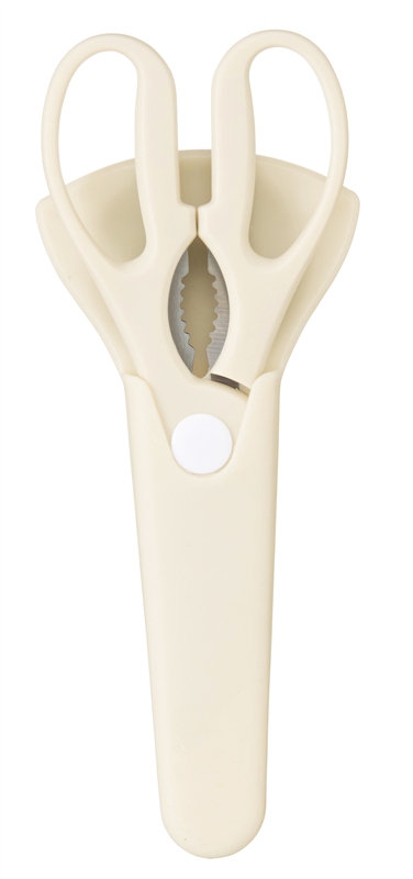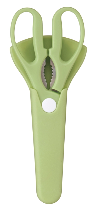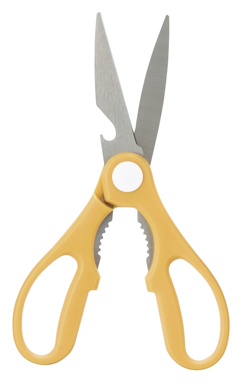 さわやかなグリーン/イエロー/ホワイトの本体カラーと、それぞれに合わせた色の化粧箱でご用意しています。通常のハサミの他、栓抜き、ペットボトルオープナーの機能付き。