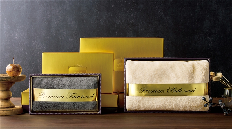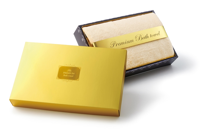 やさしいベージュで上質感アップ。ゴールドパッケージのバスタオルギフト