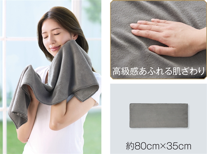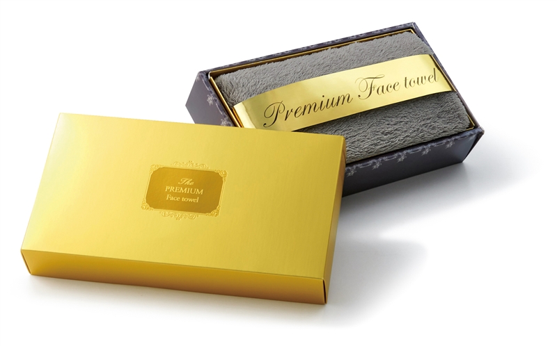 お肌にやさしくふれるやわらかな手ざわりのフェイスタオル。ゴールドの帯を巻いて、箱を開けた時の驚きまでもプレミアム。贈答品に最適な身蓋式の化粧箱がその価値をさらに高めます。