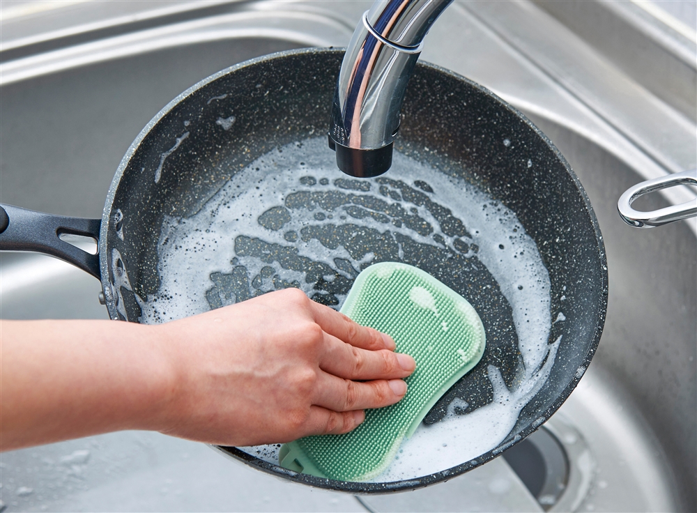 フライパンや食器はもちろん、細かいブラシ形状でザル洗いにも最適!使い終わったら裏面の吸盤でシンクにくっつけておけます。吊り下げ保管もOK。
