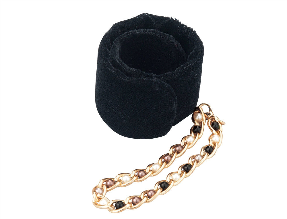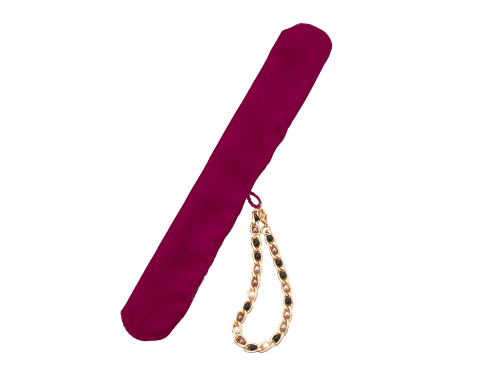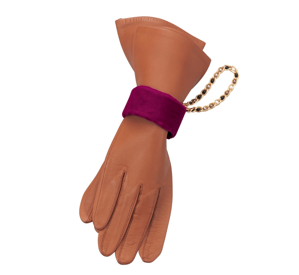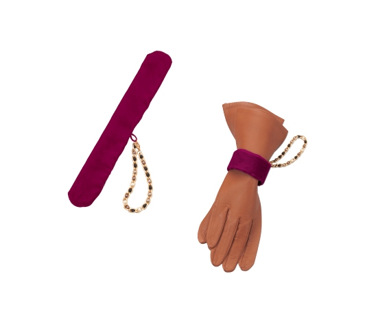 中に芯材が入っており、クルッと丸めて手袋をはさんで使います。光沢のあるベロア生地とゴールドチェーンが高級感たっぷり。もちろん簡単にバッグなどに取り付けられます。