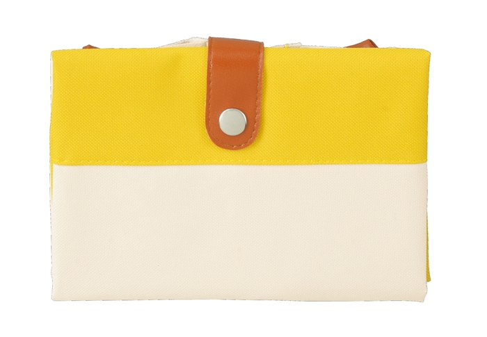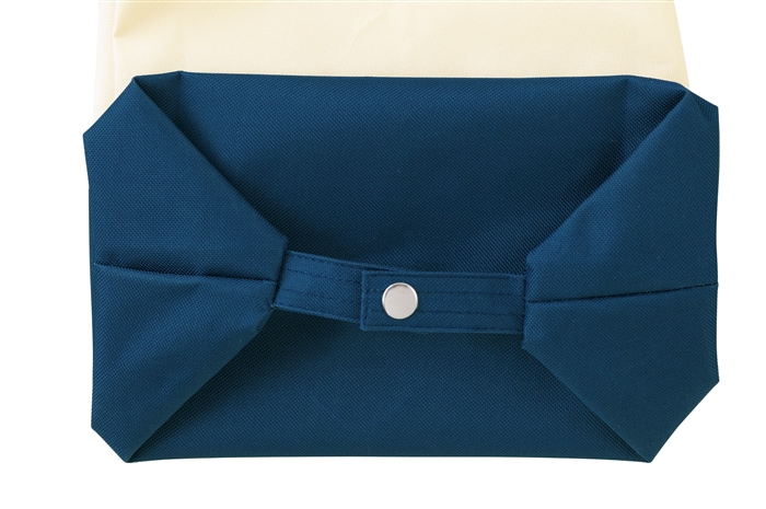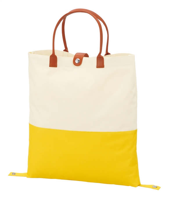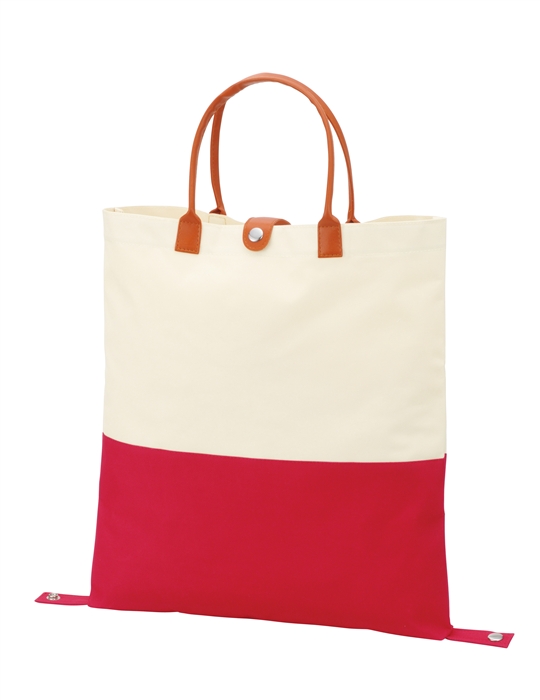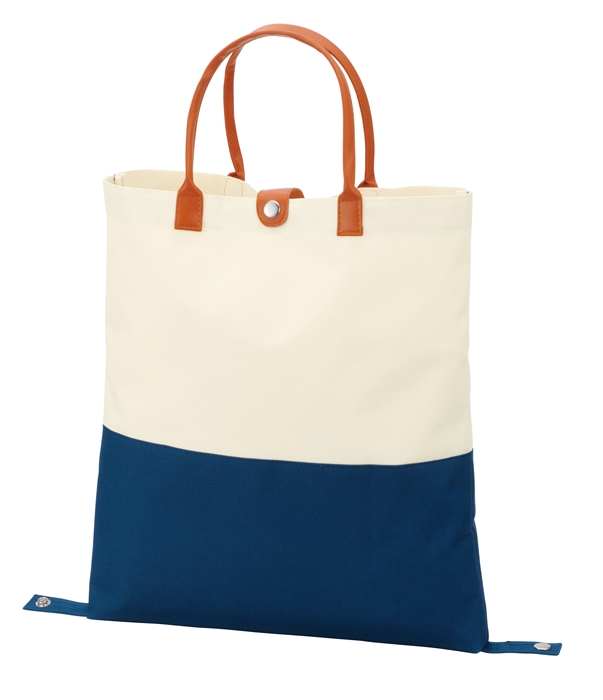 底のボタンを留めることでマチが作れ、シーンに応じてバッグの形状を変えられます。折りたためるので、持ち運びに便利。B4サイズ程度の荷物も収納可能。お買い物、旅行、イベントで大活躍。さらに、名入れ印刷が可能で、販促品として最適。レザー調の持ち手が高級感を演出し、購入者特典やセミナーのノベルティとしても好評です。