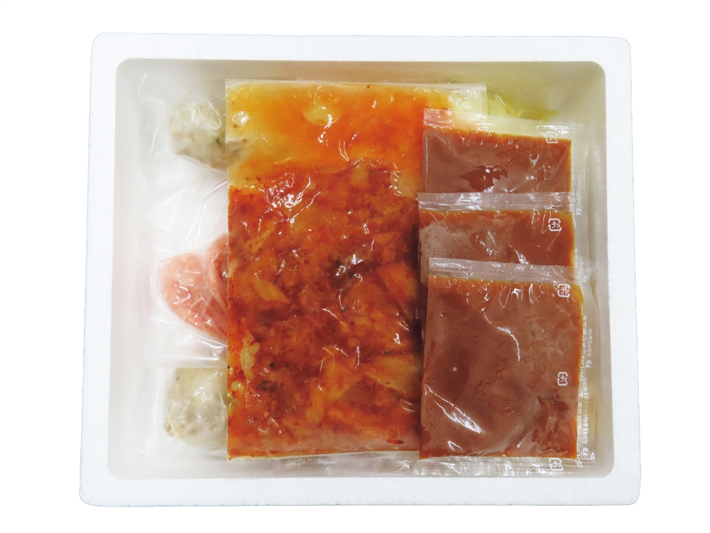 | 備考 | <セット内容> 白菜キムチ100g×1、ボイル海老×3、ボイル帆立×2、えび入つみれ×2、油揚げ×2、冷凍生ラーメン80g×1、たれ(濃縮:キムチ仕立て)30g×3 |