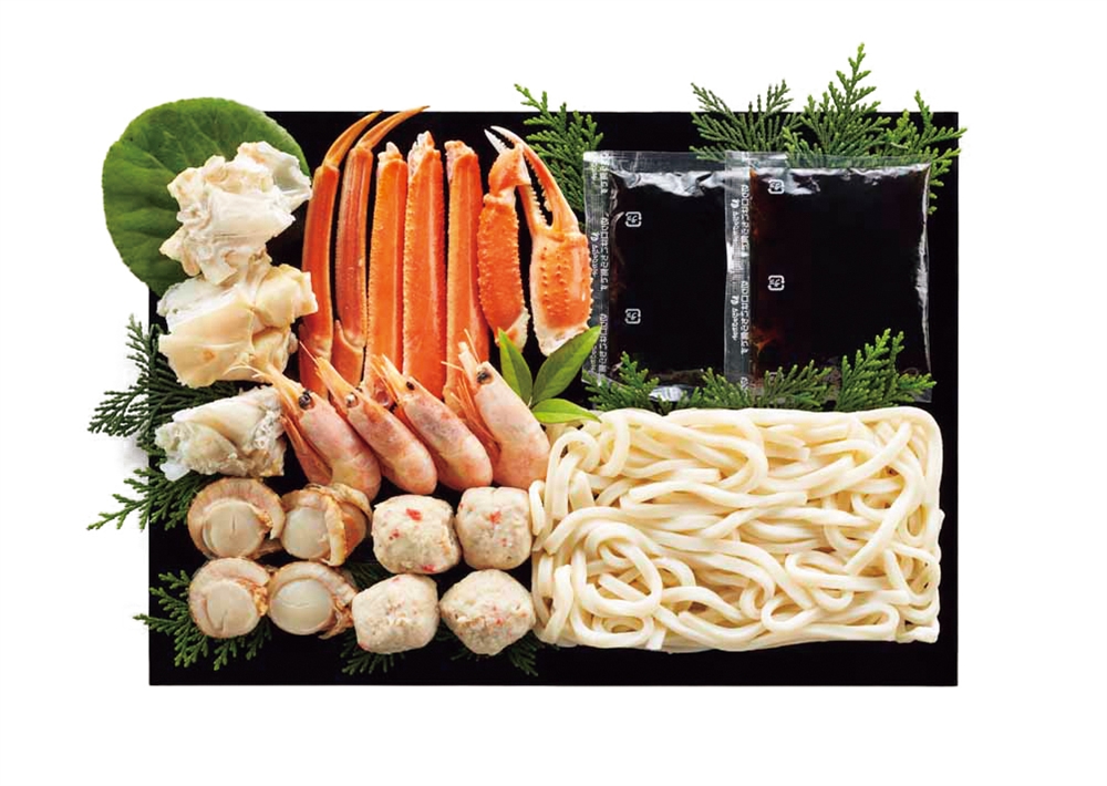 | 備考 | <セット内容> ボイル本ずわいがにカット200g、ボイル海老×4尾、ボイル帆立×4個、かに入つみれ×4個、冷凍うどん250g×1玉、たれ(濃縮:醤油仕立て)50ml×2袋 |