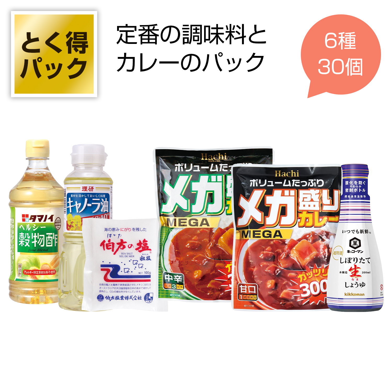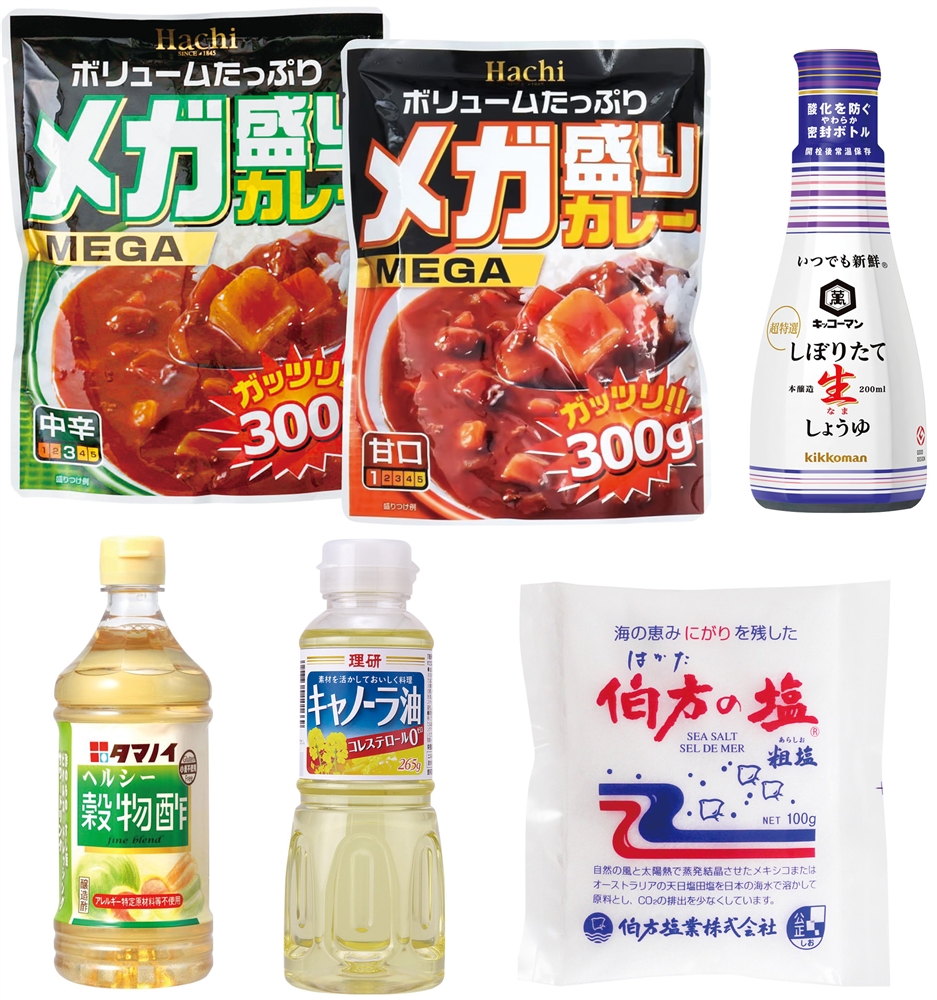 | 備考 | <セット内容> キッコーマン しぼりたて生しょうゆ200ml×5 理研 キャノーラ油265g×5 伯方塩業 伯方の塩100g×5 タマノイ ヘルシー穀物酢500ml×5 ハチ食品 メガ盛りカレー300g甘口×5 ハチ食品 メガ盛りカレー300g中辛×5 |