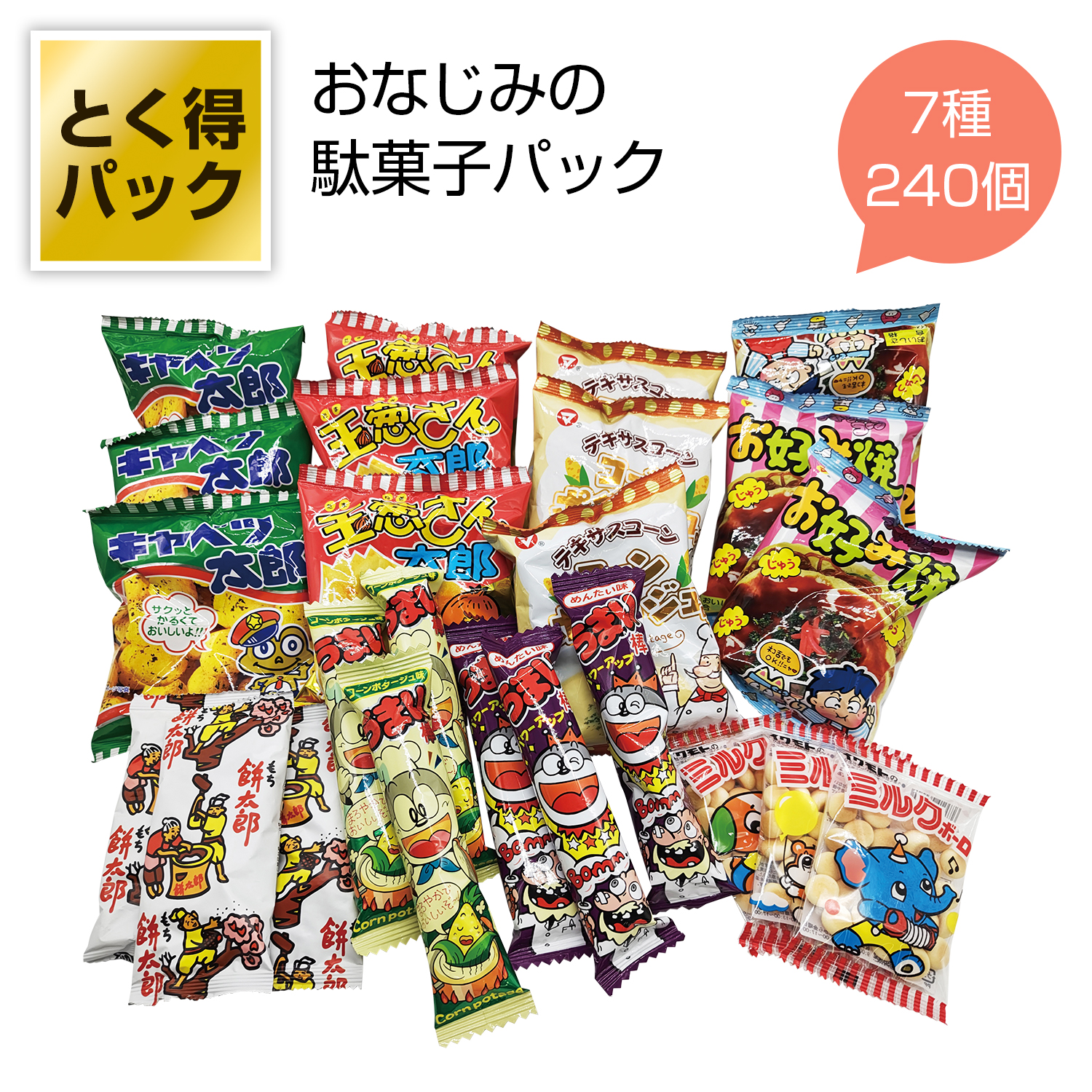 | 備考 | <セット内容> キャベツ太郎×30 玉ねぎ太郎×30 餅太郎×30 ミルクボーロ×30 お好み焼き×30 コーンポタージュ×30 うまい棒(2種) ×60 |