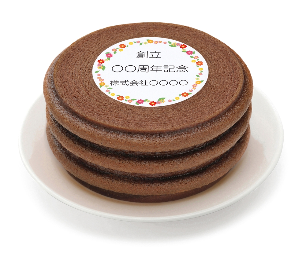 木の幹のような凹凸を表現しながら丁寧にふんわり焼き上げたショコラバームクーヘンです。のし・包装、周年記念シール貼り対応が可能です。