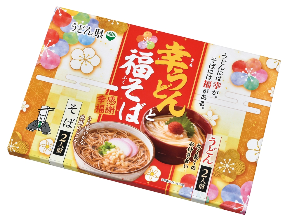 年越しそば、年明けうどんとしても、うどんとそばの定番食べ比べセットとしても。老若男女に人気の麺セットです。香川県公式キャラクター・うどん県観光課係長「うどん健」のマーク入り。幸福感満載の明るいパッケージも魅力の一つです。