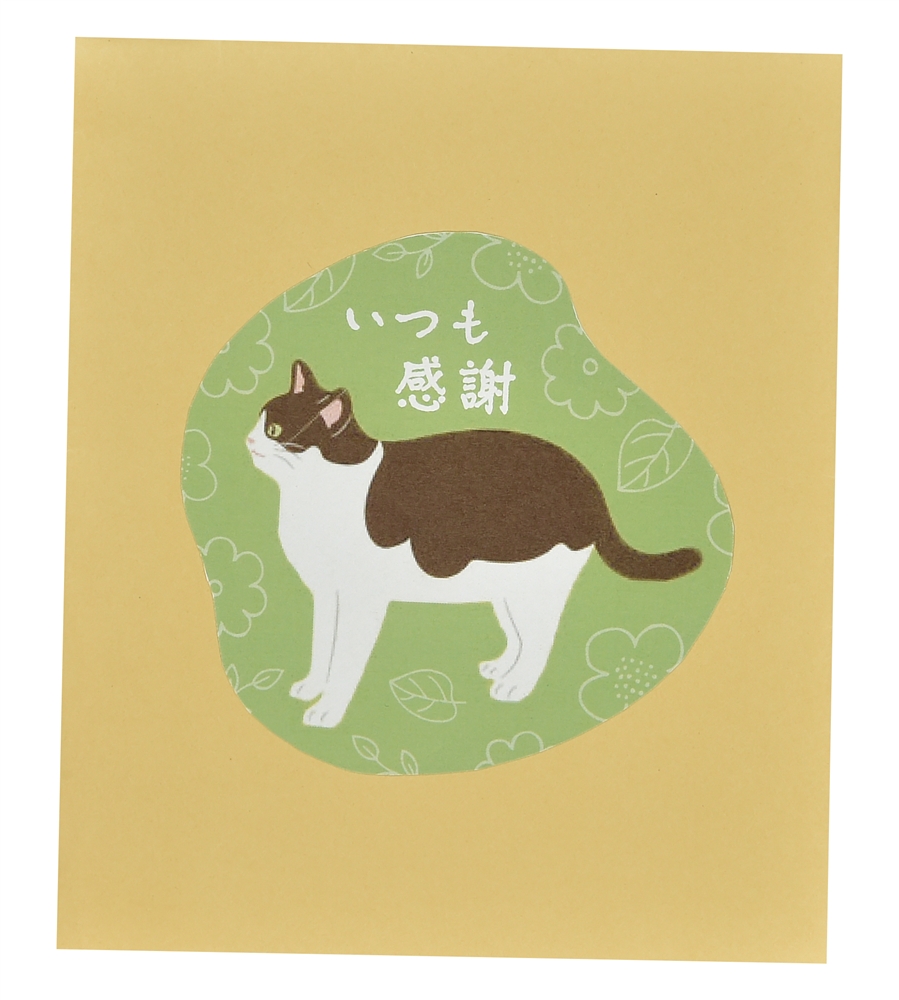 リラックスしたにゃんこが目印。 ありがとうございます/ほんの気持ちです/いつも感謝 の3種類のメッセージをご用意しています。(中身共通) それぞれ50個単位150個以上(以降50個単位)でお申込みいただけます。