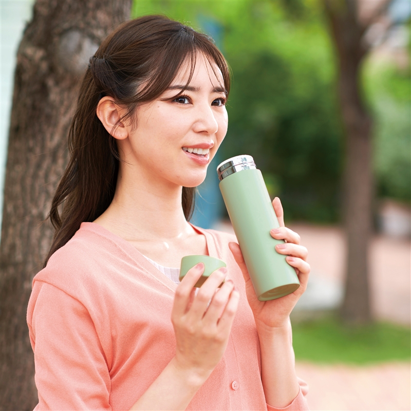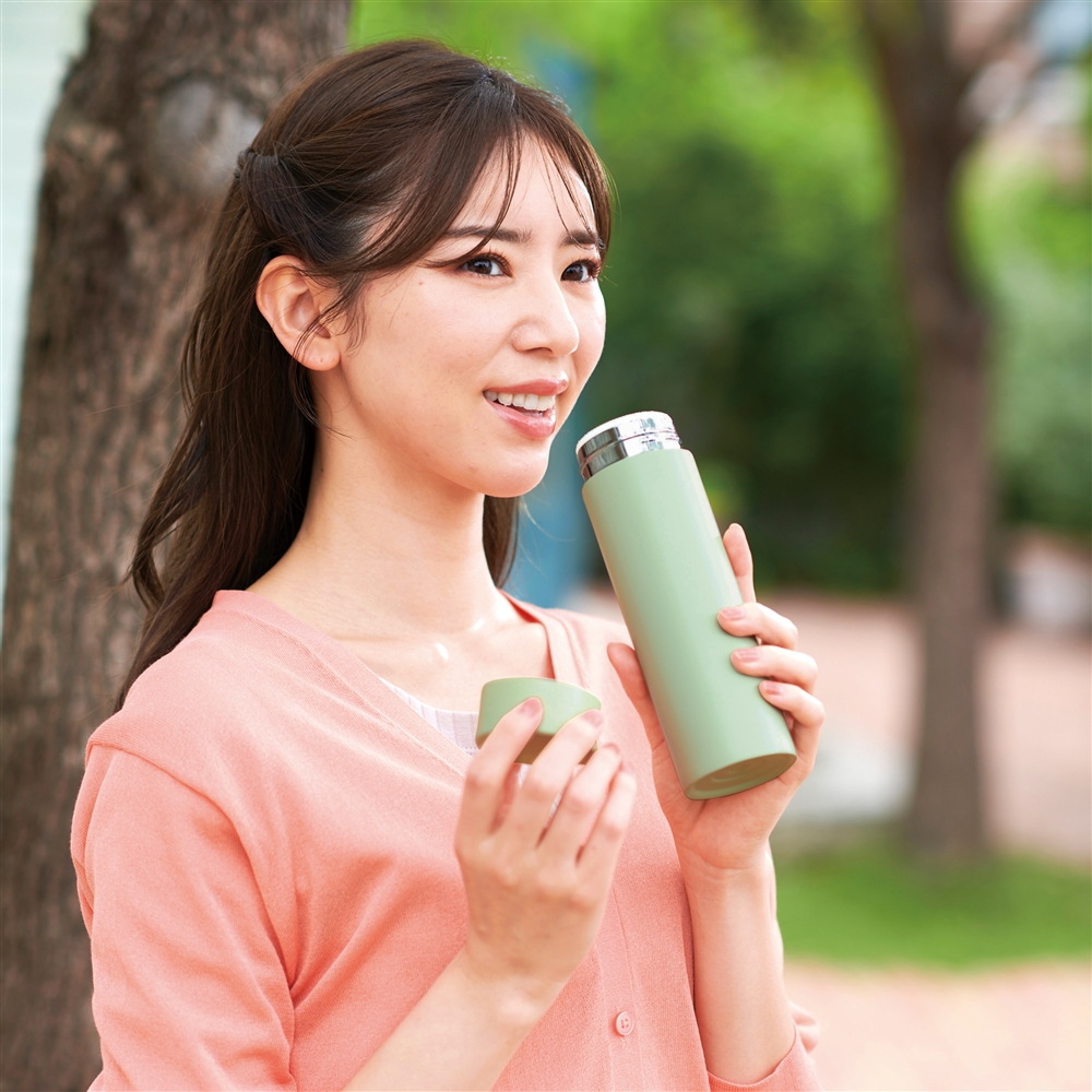 氷やティーバッグが入っていても飲みやすいストッパー付き。ペットボトル程度のサイズなので、普段の持ち歩き用やランチにもぴったりです。 ナチュラルなオフホワイト/グリーン/ブルーの3色展開。