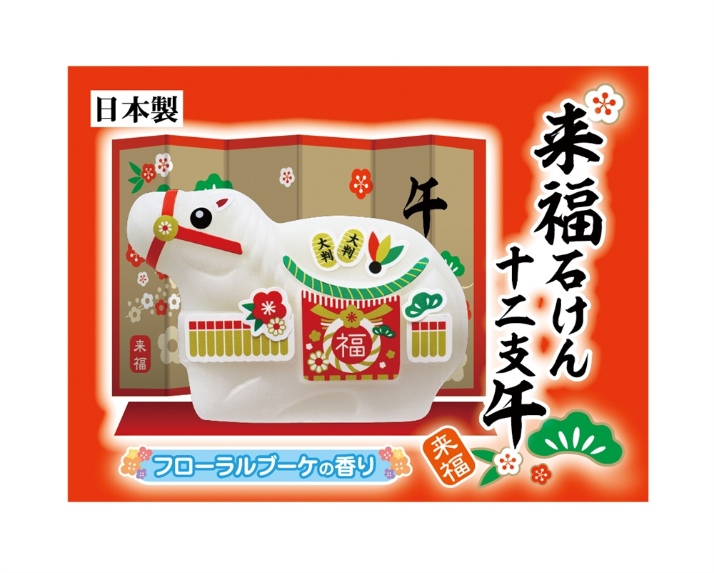 セットのシールを貼り付けて飾っていただく干支石鹸。