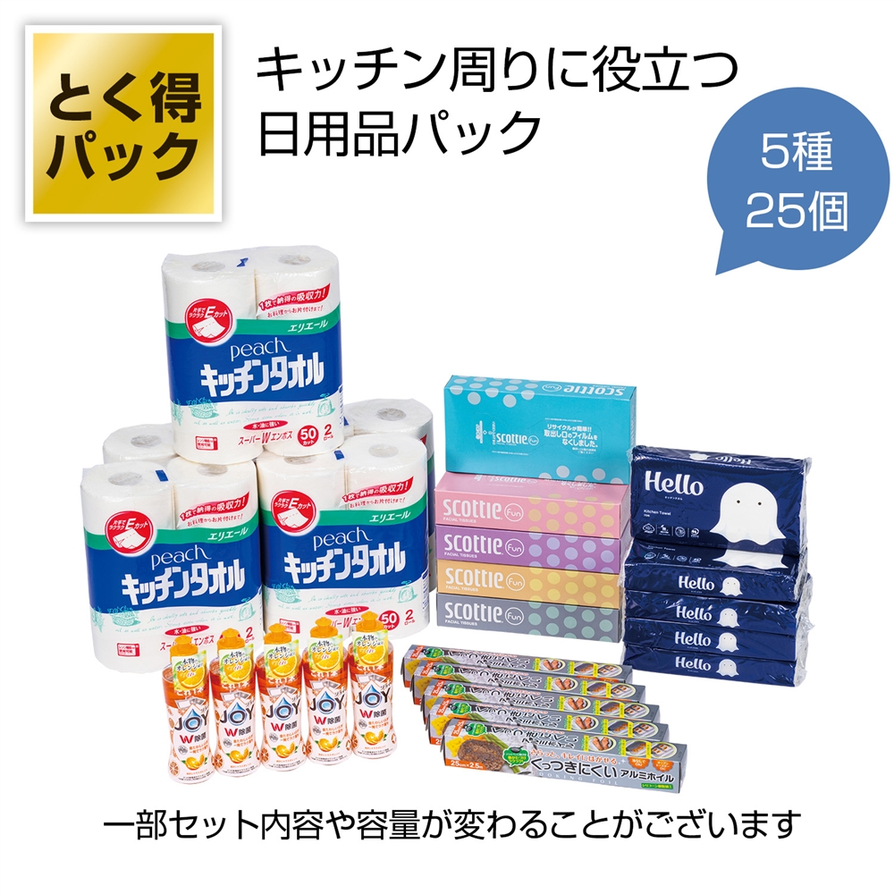 | 備考 | <セット内容> ・エリエールピーチキッチンタオル2ロール(50カット)×5 ・P&G除菌ジョイコンパクト170ml(シトラスオレンジ)×5 ・ハローキッチンペーパー70枚×5 ・スコッティティシューファン120W×5 ・くっつきにくいアルミホイル(25cm×2.5m)×5 ※スコッティティシューファン120Wは5色アソートになります。 |