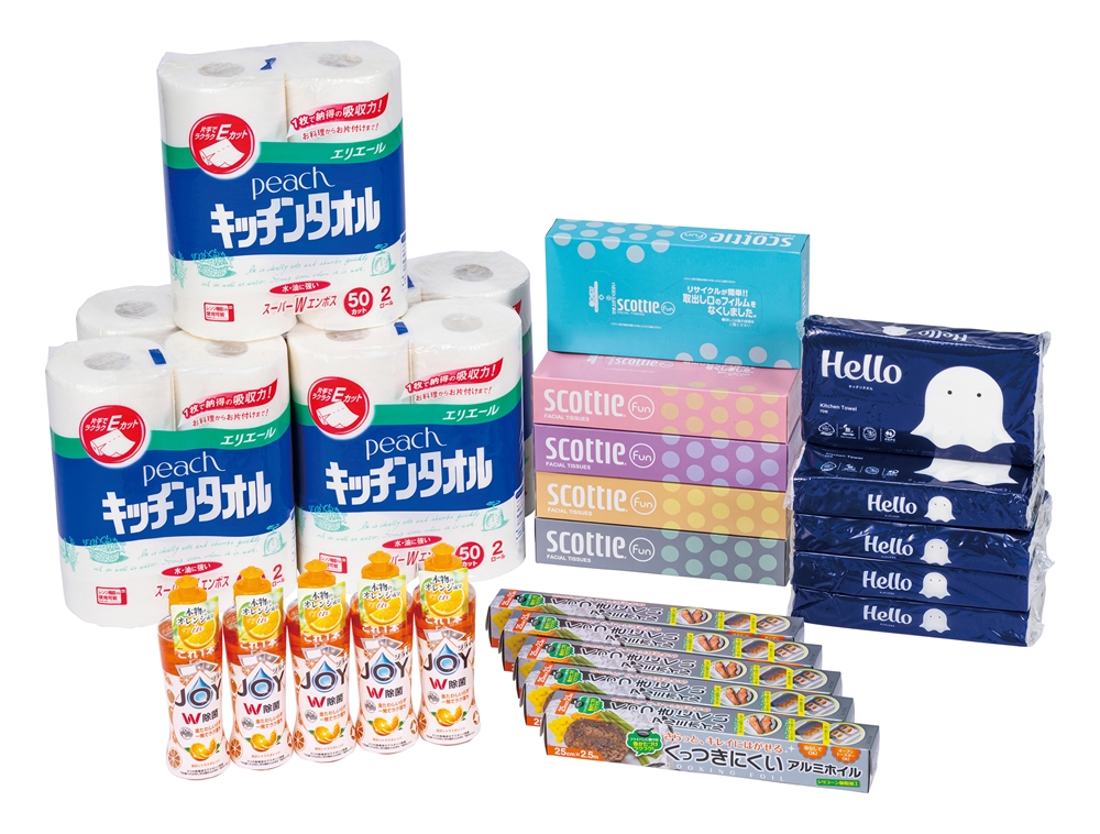 有名メーカーのキッチンタオルや食器用洗剤など、毎日の家事で役立つアイテムを厳選!実用性を兼ねたお得な詰め合わせパック。