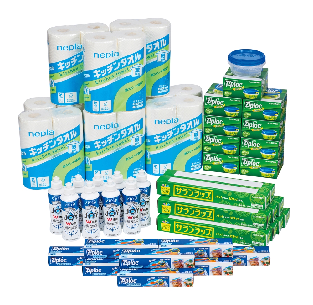 | 備考 | <セット内容> ・ネピア激吸収キッチンタオル2ロール(50カット)×9 ・P&G除菌ジョイコンパクト170ml(さわやか微香)×9 ・サランラップ(30cm×10m)×9 ・ジップロックフリーザーバッグM3枚×9 ・ジップロックスクリューロック300ml×9 |