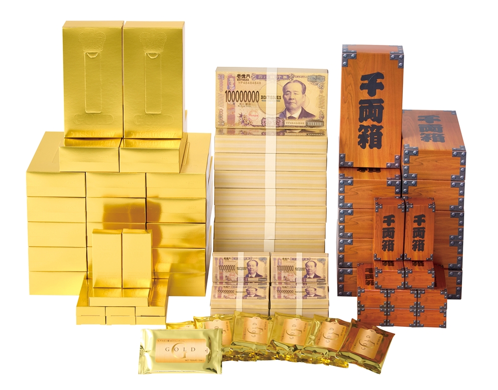 | 備考 | <セット内容> ・千両箱ボックスティッシュ150W×10 ・ミニ千両箱ボックスティッシュ20W×10 ・壱億円ボックスティッシュ40W×10 ・ミニミニ壱億円ボックスティッシュ10W×10 ・ゴールドBOXティッシュ80W2個組×10 ・ミニミニゴールドBOXティッシュ10W×10 ・ゴールドウェットティッシュ10枚×10 |