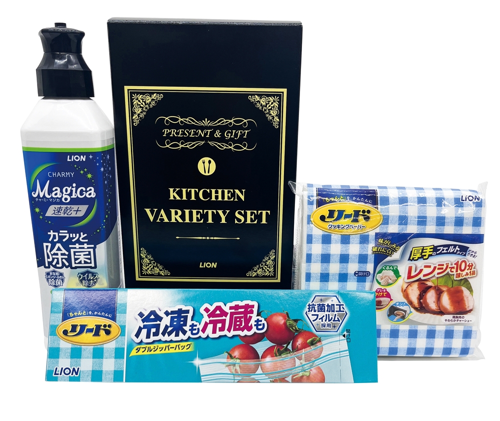 ■高級感漂うデザイン ■チャーミーマジカ:洗い始めから油汚れを水のように「サラサラ落とせて」手早く片づく、ナノ洗浄の台所用洗剤 ■ヘルシークッキングペーパー:厚みのある不織布で油や水をたっぷり吸収・保持できるクッキングペーパー ■保存バッグ:抗菌加工フィルムを採用した、冷凍・冷蔵兼用のジッパー付き食品保存バッグ