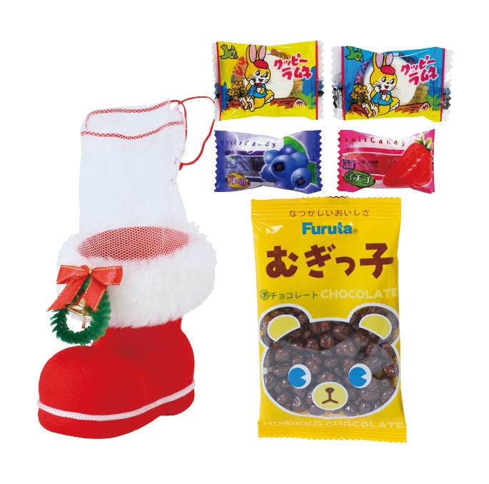 お菓子がたっぷり詰まったクリスマスブーツ、どれが当たるかな?