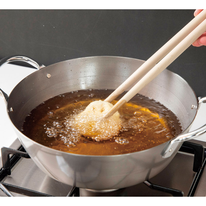 1.6㎜の鉄厚板で、高い蓄熱性を実現します。口が広く、揚げる際に出る水分を飛ばすのに適しています。プロ仕様の粉箸付きです。