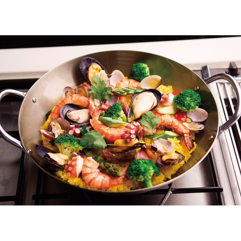 予熱したり、強火を扱うハードな調理に最適の鉄製パエリア鍋です。一般のパエリア鍋よりも深めで調理が楽です。そのまま卓上にも出せ、調理、蒸らしに便利なガラス蓋付き。両手フライパンとして、焼物などにもお使い頂けます。