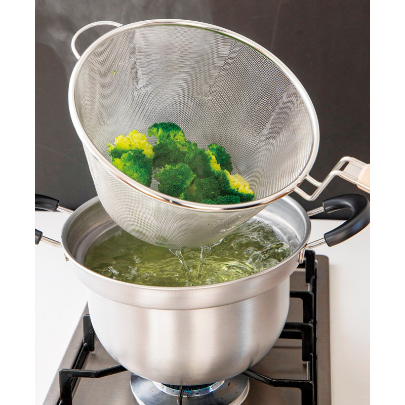熱回りのいいステンレスの両手鍋に、握りやすい木柄付きのザルがセットされています。鍋にザルを入れた状態で茹でれば、タイミングを逃すことなく引き上げることができます。また、鍋本来の機能も秀逸です。本体上部につけた段と曲線を描く構造の合せ技で吹きこぼれにくく、煮物などにも重宝すること間違いありません。