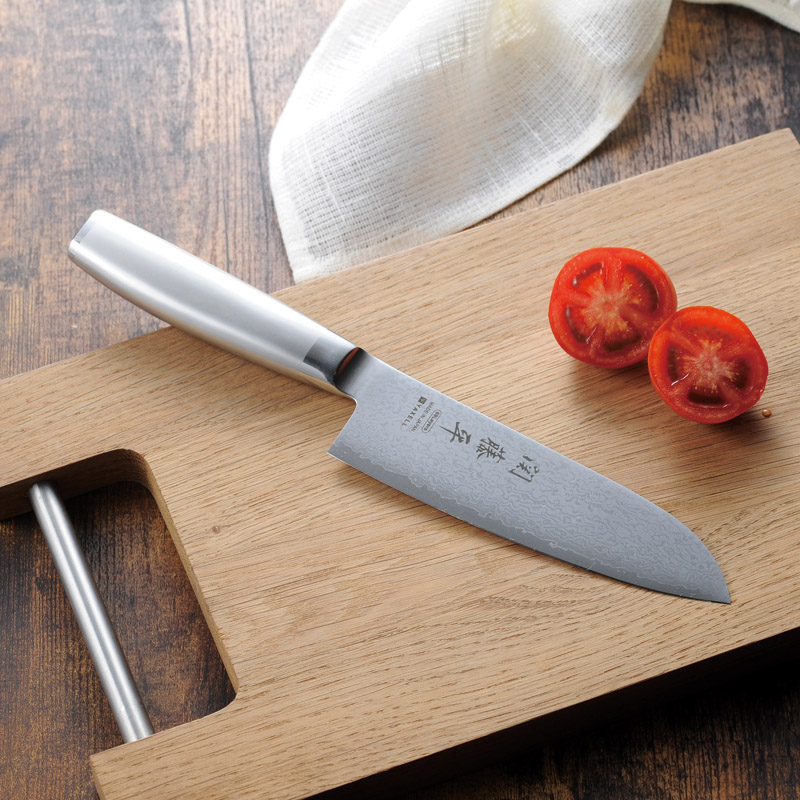 同じ波紋は二つとない高級包丁の代名詞ダマスカス包丁です。衛生的で使いやすいシンプルなデザイン。ハンドル内部が空洞なので軽くてとりまわしに優れた包丁です。