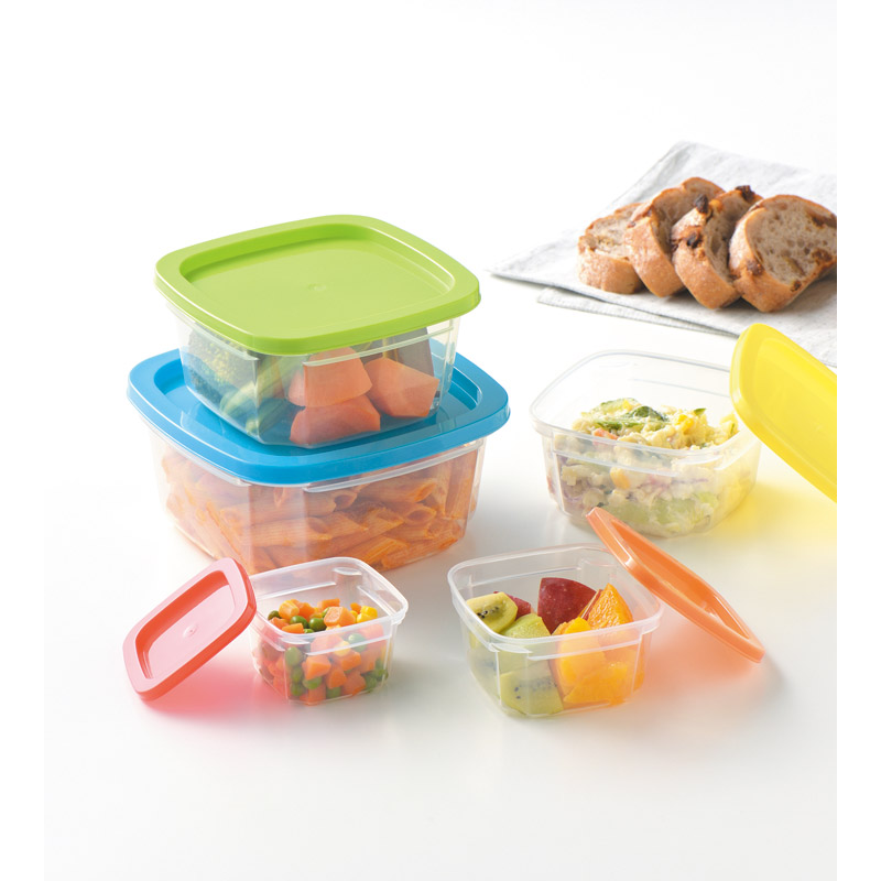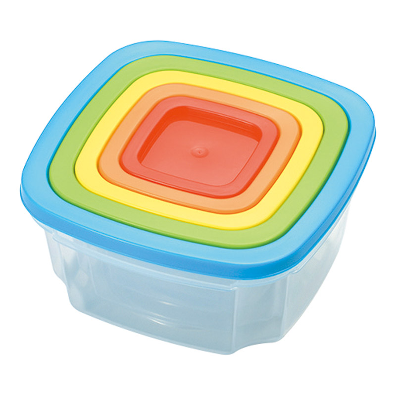 重ねて収納できて、使わないときはコンパクトに。フタは区別しやすい5カラー。本体が透明なので保存した内容を確認しやすい。冷蔵・冷凍対応で食材の小分けや作り置きおかずの保存に便利。本体は電子レンジ対応で、おかずを温めてそのまま食べられます。食洗機OK。