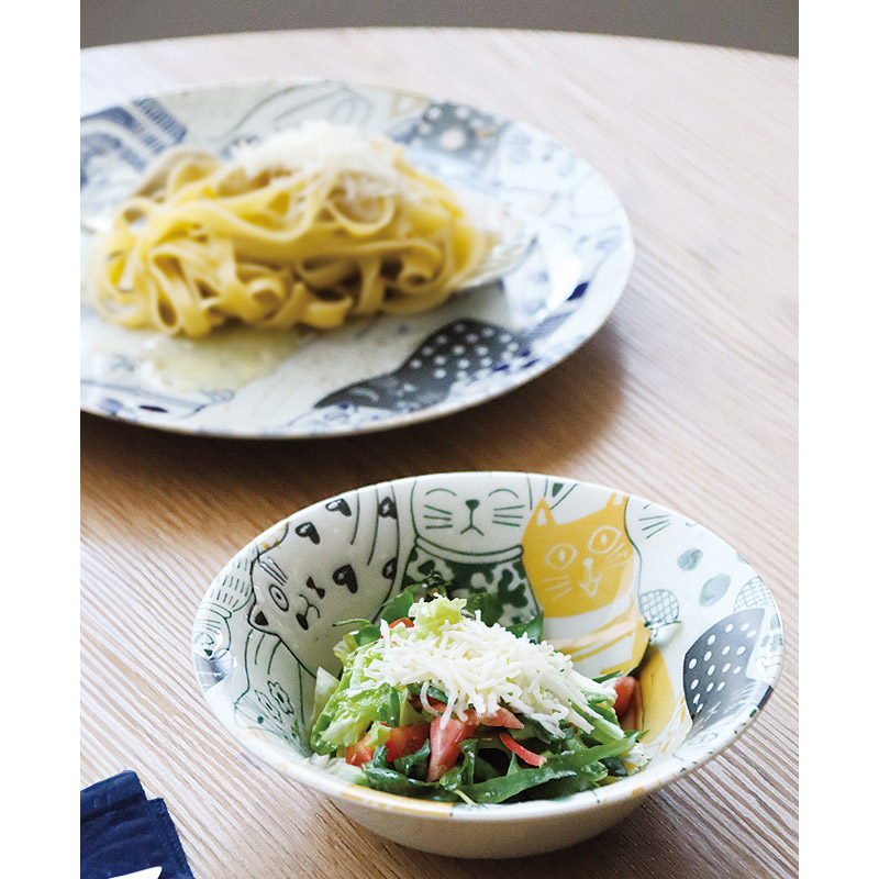 ユーモアと個性あふれるスタイルの8匹がぞろりぞろり。可愛らしい猫いっぱいの柄が特徴的で食卓を明るく彩ります。