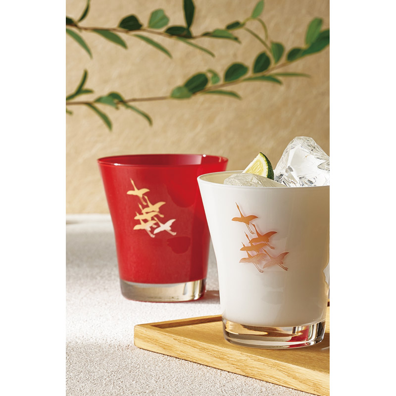 ログイン紀州漆器×ガラス 紅白のおめでたい「ぬり色」に千羽鶴をあしらいました。長寿のお祝いや贈り物、記念品にピッタリのアイテムです。