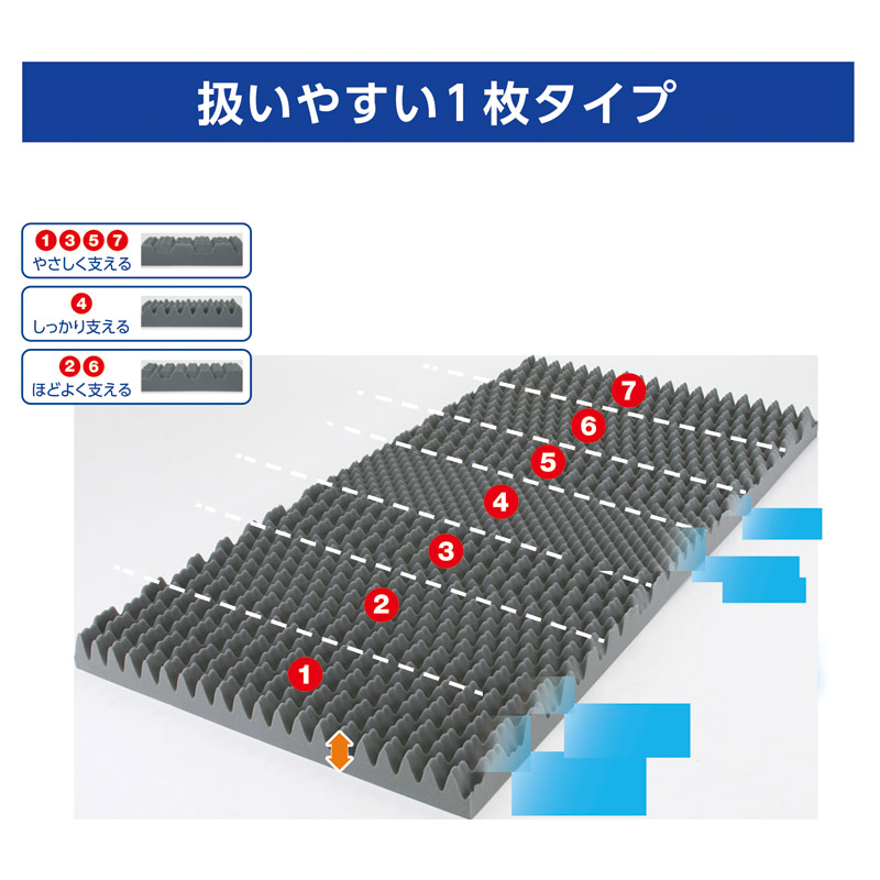 通気性がよく、ほどよい硬さで無理なく寝返りをサポート。身体に合わせた構造が腰や肩への負担を軽減します。側地は取り外して丸洗い可能です。ベッドマットレスの上に重ねて、また、床に直接敷いてお使いいただけます。ご使用なさらないときは風通しのよいところにたてかけておくだけで大丈夫です。扱いやすい1枚タイプ。