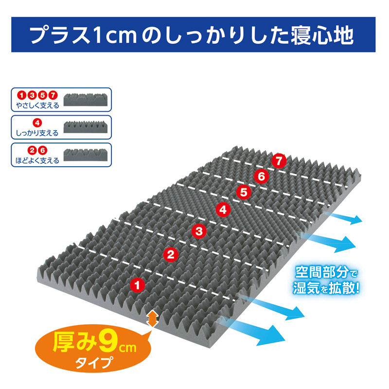 通気性がよく、ほどよい硬さで無理なく寝返りをサポート。身体に合わせた構造が腰や肩への負担を軽減します。側地は取り外して丸洗い可能です。ベッドマットレスの上に重ねて、また、床に直接敷いてお使いいただけます。ご使用なさらないときは風通しのよいところにたてかけておくだけで大丈夫です。プラス1㎝のしっかりした寝心地。