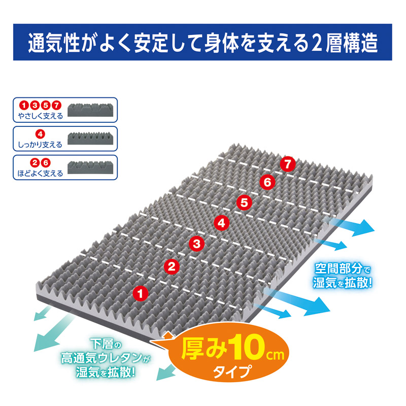通気性がよく、ほどよい硬さで無理なく寝返りをサポート。身体に合わせた構造が腰や肩への負担を軽減します。側地は取り外して丸洗い可能です。ベッドマットレスの上に重ねて、また、床に直接敷いてお使いいただけます。ご使用なさらないときは風通しのよいところにたてかけておくだけで大丈夫です。通気性がよく安定して身体を支える2層構造。